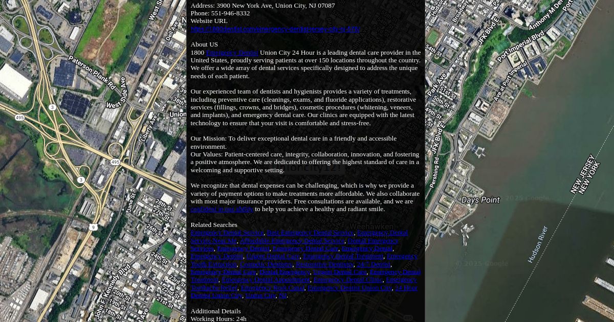 Address: 3900 New York Ave, Union City, NJ 07087 Phone: 551-946-8332 Website URL https://1800dentist.com/emergency-dentist-jersey-city-nj-576/