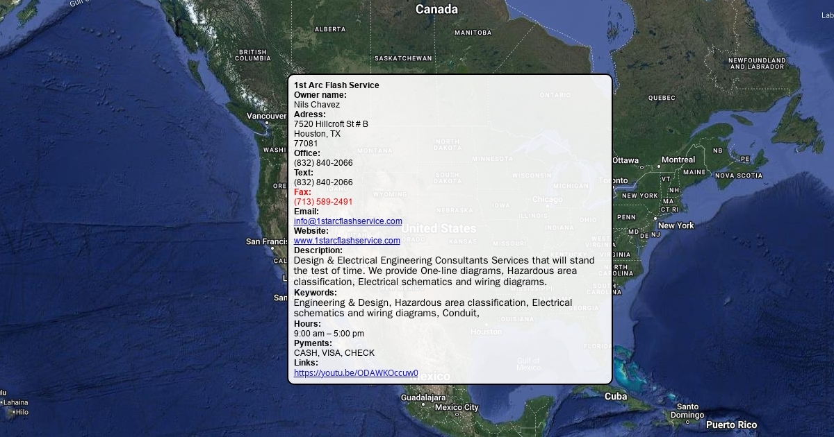 Owner name: Nils Chavez Adress: 7520 Hillcroft St # B Houston, TX 77081 Office: (832) 840-2066 Text: (832) 840-2066 Fax: (713) 589-2491 Email: [email protected] Website: www.1starcflashservice.com Description: Design & Electrical Engineering Consultants Services that will stand the test of time. We provide One-line diagrams, Hazardous area classification, Electrical schematics and wiring diagrams, Keywords: Engineering & Design, Hazardous area classification, Electrical schematics and wiring diagrams, Hours: 9:00 am – 5:00 pm Pyments: CASH, VISA, CHECK Links: https://youtu.be/ODAWKOccuw0
