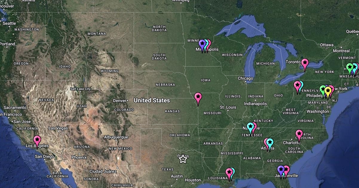 The locations of all the teams in the 2018 NFL playoffs.