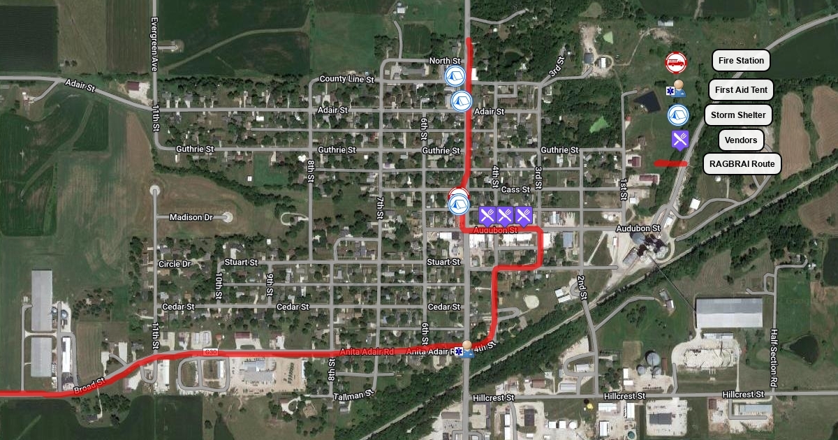 Route, Vendors, First Aid Station, Fire Station, and Storm Shelters.