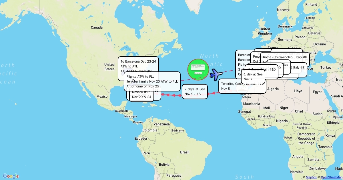 Fly to Barcelona Back to Back to Back to Back 8 days Mediterranean 12 Days crossing 3 days Bahamas 4 days with kids first cruise Home from Ft Lauderdale