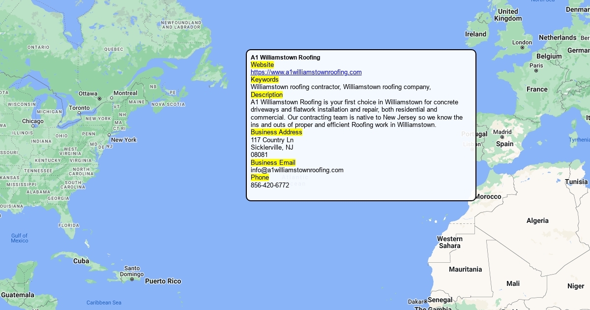 Website https://www.a1williamstownroofing.com Keywords Williamstown roofing contractor, Williamstown roofing company, Description A1 Williamstown Roofing is your first choice in Williamstown for concrete driveways and flatwork installation and repair, both residential and commercial. Our contracting team is native to New Jersey so we know the ins and outs of proper and efficient Roofing work in Williamstown. Business Address 117 Country Ln Sicklerville, NJ 08081 Business Email [email protected] Phone 856-420-6772