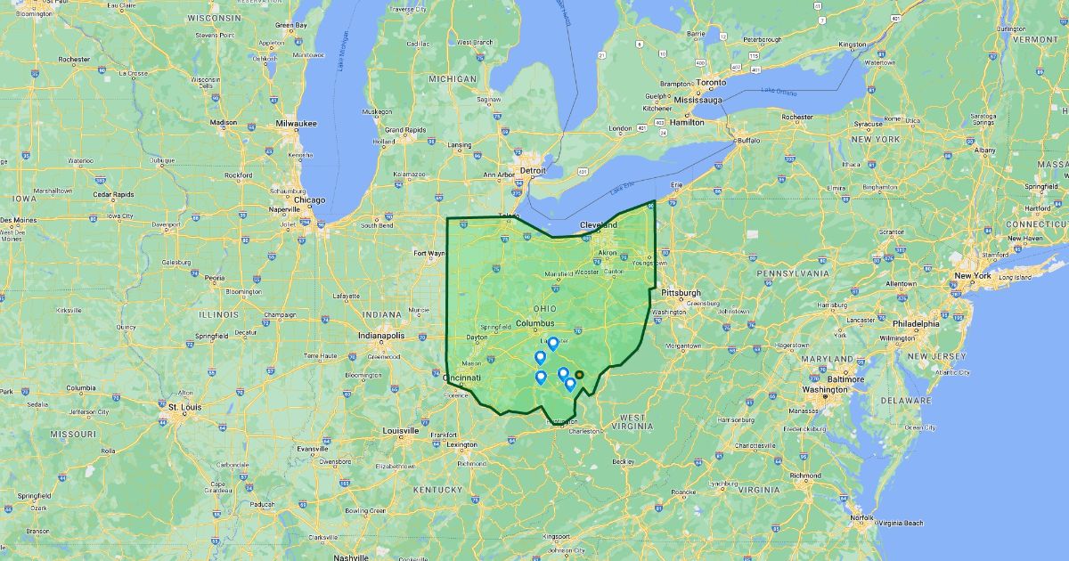 Map of the facilities that received C&DD from Athens-Hocking Waste between 2010 and 2015