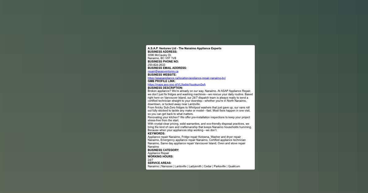 A.S.A.P. Ventures Ltd - The Nanaimo Appliance Experts