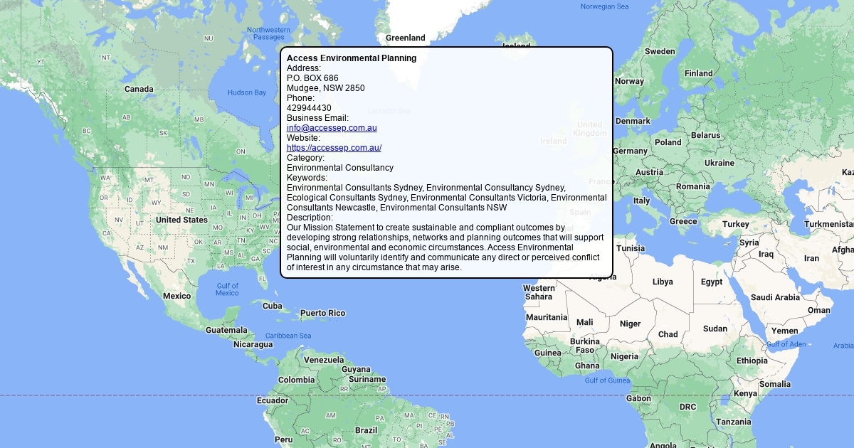 Our Mission Statement to create sustainable and compliant outcomes by developing strong relationships, networks and planning outcomes that will support social, environmental and economic circumstances. Access Environmental Planning will voluntarily identify and communicate any direct or perceived conflict of interest in any circumstance that may arise.