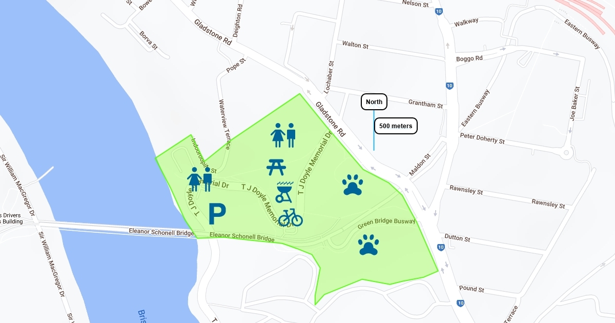 Barbecue (wood), basketball half court (Gladstone Road), bikeway and pathway network, dog off-leash area (Gladstone Road), drive (Doyle Memorial Park), kick-a-bout space (Eleanor Schonell Bridge), outdoor fitness/exercise station (Harmony Gardens), picnic area/shelter (Harmony Gardens, TC Doyle Memorial Park), playground (Harmony Gardens), public toilet (Harmony Gardens), vantage point (Gladstone Road), bike racks, water (bubblers, drinking fountain)