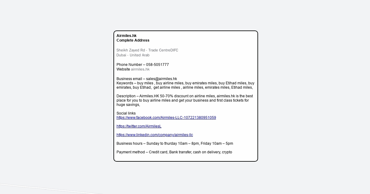 Description – Airmiles.HK 50-70% discount on airline miles, airmiles.hk is the best place for you to buy airline miles and get your business and first class tickets for huge savings,