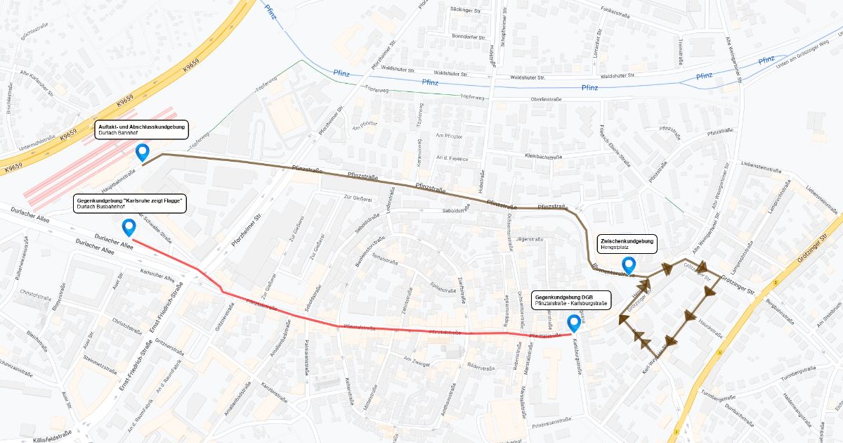 Karte für den geplanten Naziaufmarsch am 3. Juni 2017 in Karlsruhe Durlach