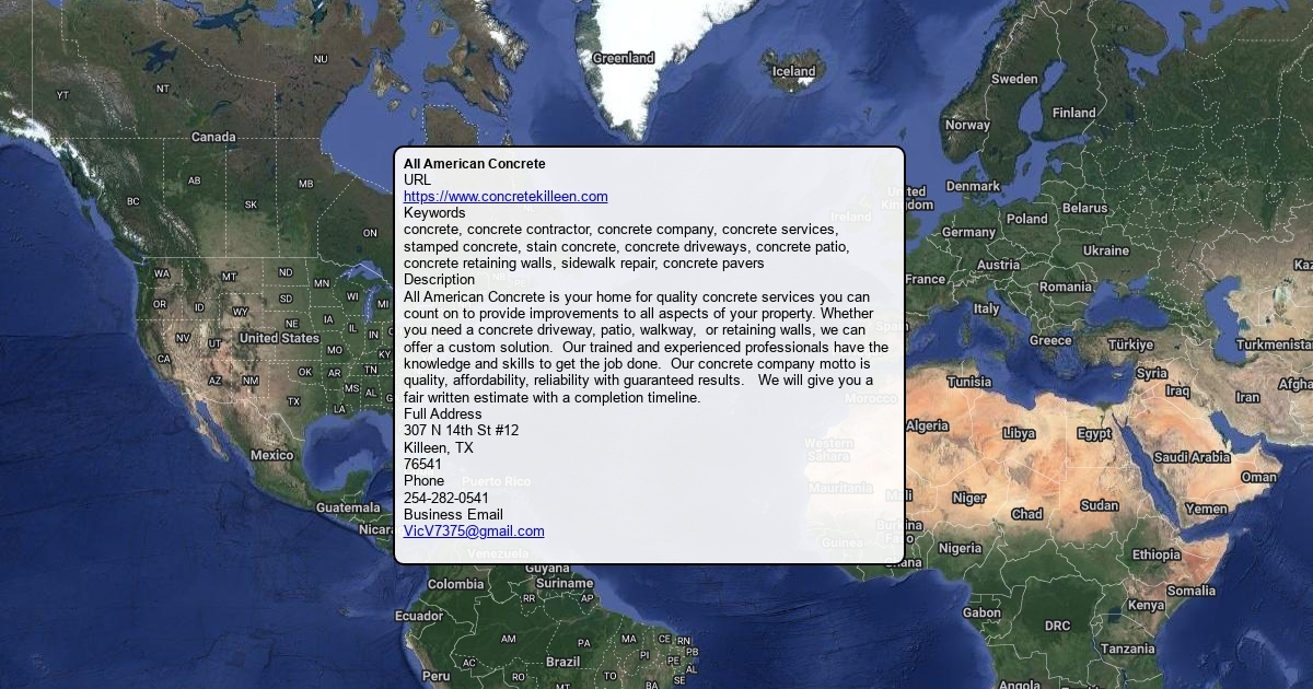 URL https://www.concretekilleen.com Keywords concrete, concrete contractor, concrete company, concrete services, stamped concrete, stain concrete, concrete driveways, concrete patio, concrete retaining walls, sidewalk repair, concrete pavers Description All American Concrete is your home for quality concrete services you can count on to provide improvements to all aspects of your property. Whether you need a concrete driveway, patio, walkway, or retaining walls, we can offer a custom solution. Our trained and experienced professionals have the knowledge and skills to get the job done. Our concrete company motto is quality, affordability, reliability with guaranteed results. We will give you a fair written estimate with a completion timeline. Full Address 307 N 14th St #12 Killeen, TX 76541 Phone 254-282-0541 Business Email [email protected]