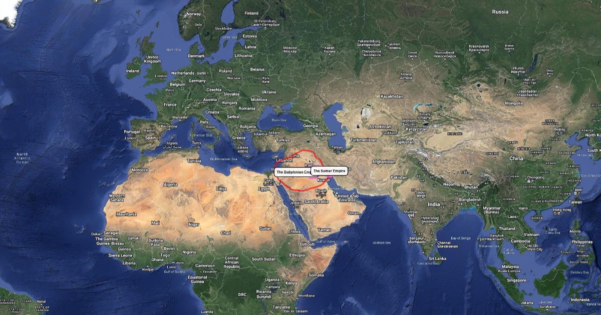 The red circle is the Babylonian Empire and the pink is the Sumer Empire.