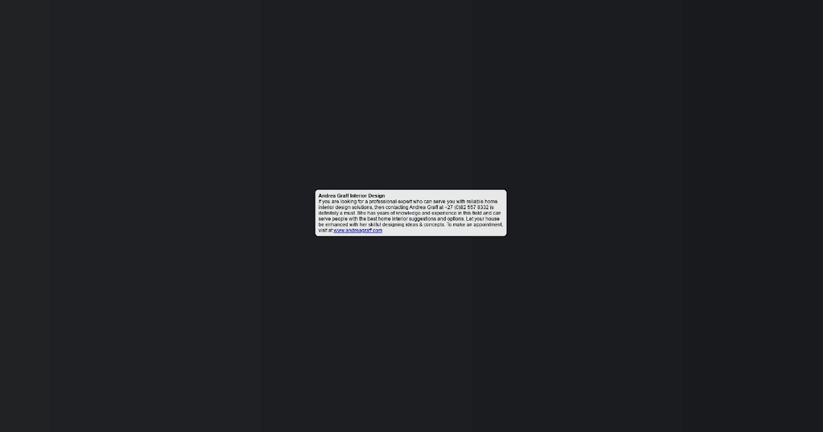 If you are looking for a professional expert who can serve you with reliable home interior design solutions, then contacting Andrea Graff at +27 (0)82 557 8332 is definitely a must. She has years of knowledge and experience in this field and can serve people with the best home interior suggestions and options. Let your house be enhanced with her skilful designing ideas & concepts. To make an appointment, visit at www.andreagraff.com