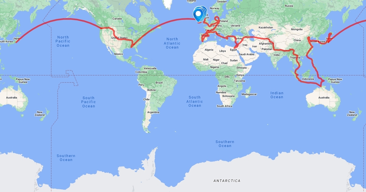 General route for post college intercontinental backpacking trip through Europe and South Asia