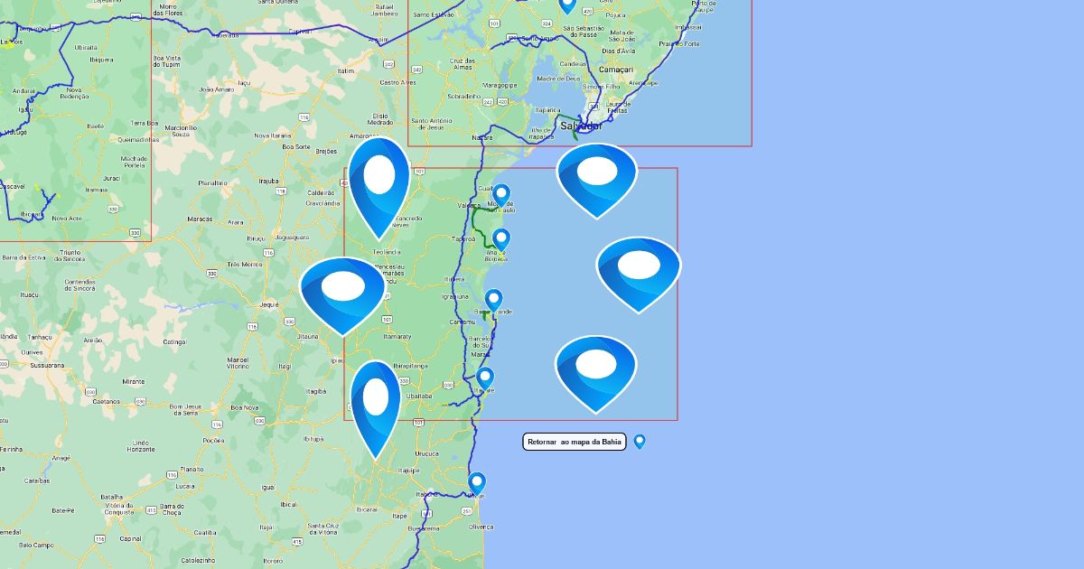 Roteiro da Expedição 1000dias - Bahia, região do litoral central. Use os ícones para acessar as atrações que visitamos na região ou então os controles de zoom para ver nosso roteiro com mais detalhes