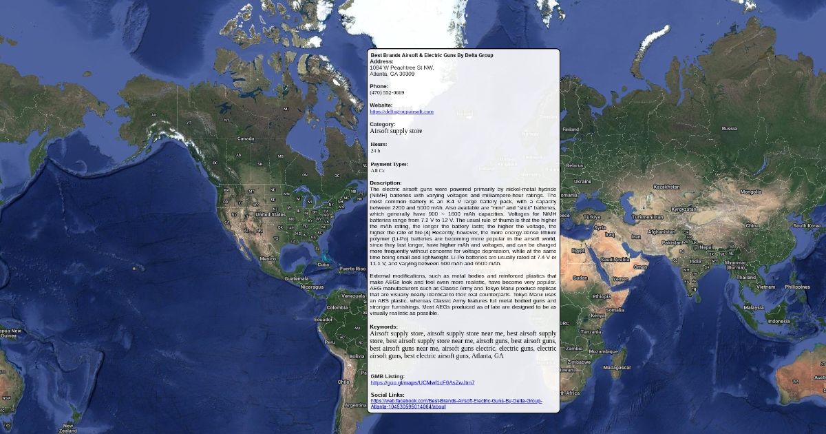 Address: 1084 W Peachtree St NW, Atlanta, GA 30309 Phone: (470) 552-0869 Website: https://deltagroupairsoft.com Category: Airsoft supply store Hours: 24 h Payment Types: All Cc