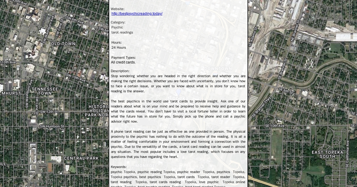 Address: Serving Topeka, KS 66607 Phone: 785-329-1209 Website: http://bestpsychicreading.today/ Category: Psychic tarot readings Hours: 24 Hours Payment Types: All credit cards. Description: Stop wondering whether you are headed in the right direction and whether you are making the right decisions. Whether you are faced with uncertainty, you don’t know how to face a certain issue, or you want to know about what is in store for you, tarot reading is the answer. GMB Listing: https://goo.gl/maps/ABFoBEvGGAdtxcHi6 Social Links: https://youtu.be/OI8wTjlEj_Q https://web.facebook.com/pg/Best-Psychic-Reading-100699095119541/about https://twitter.com/BestPsychicRea4