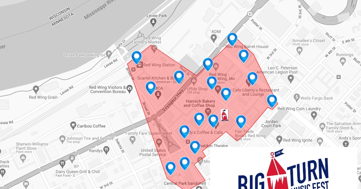 A map of the venues and times for Big Turn Music Fest in Red Wing, MN. FEB 16-17, 2018