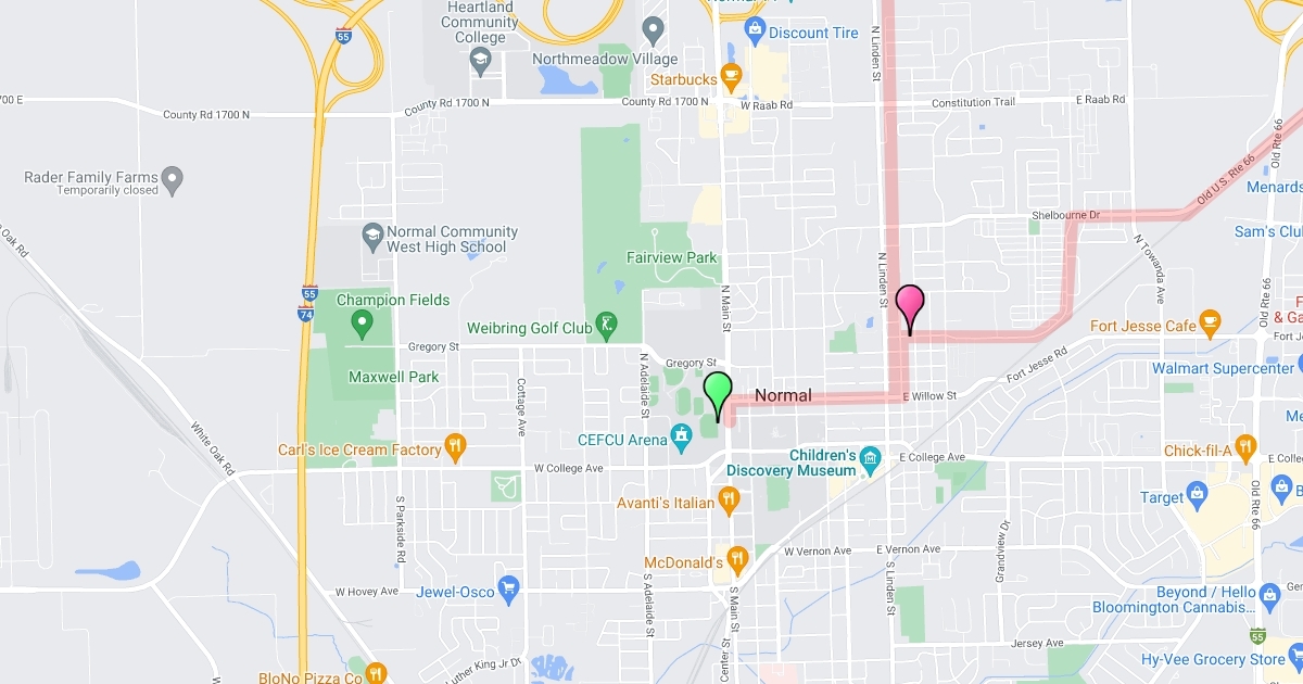 Parade Map (ISU to Ryburn Place, to Towanda, to Lake Bloomington and back)
