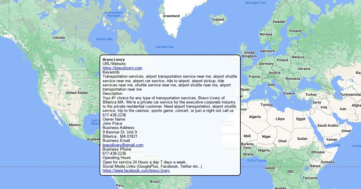 URL/Website: https://bravolivery.com Keywords Transportation services, airport transportation service near me, airport shuttle service near me, airport car service, ride to airport, airport pickup, ride services near me, shuttle service near me, airport shuttle near me, airport transportation near me Description: Your #1 choice for any type of transportation services, Bravo Livery of Billerica MA. We’re a private car service for the executive corporate industry to the private residential customer. Need airport transportation, airport shuttle service, trip to the casinos, sports game, concert, or just a night out call us 617-438-2236 Owner Name John Polce Business Address: 9 Kenmar Dr. Unit 9 Billerica , MA 01821 Business Email [email protected] Business Phone 617-438-2236 Operating Hours Open for service 24 Hours a day 7 days a week. Social Media Links (GooglePlus, Facebook, Twitter etc..) https://www.facebook.com/bravo.livery
