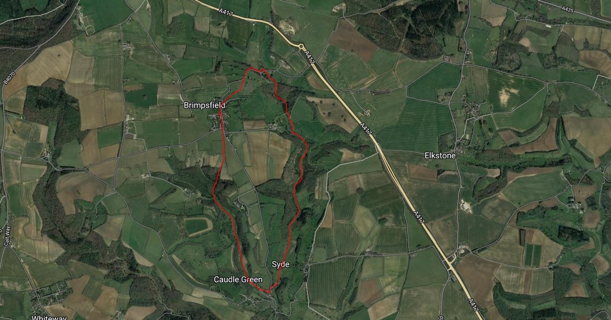 Starti8ng at Brimpsfield Village Hall, through woodland and valley to Caudle Green and on through Ostrich Wood bypassing Syde back to Brimpsfield past the site of Brimpsfield Castle.