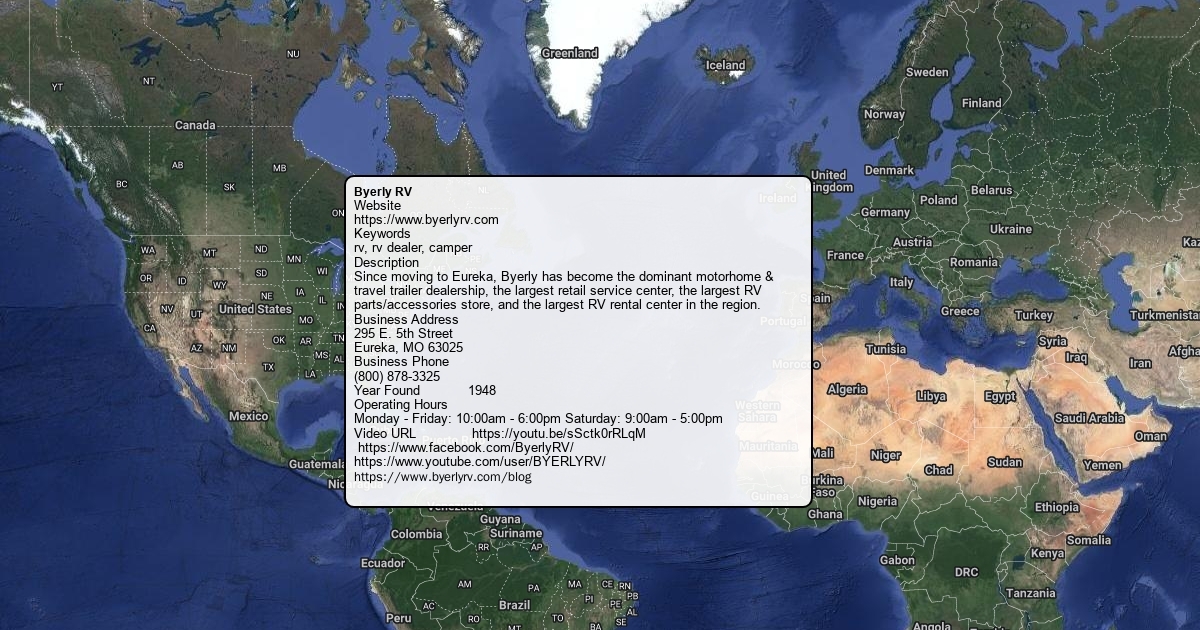 Website https://www.byerlyrv.com Keywords rv, rv dealer, camper Description Since moving to Eureka, Byerly has become the dominant motorhome & travel trailer dealership, the largest retail service center, the largest RV parts/accessories store, and the largest RV rental center in the region. Business Address 295 E. 5th Street Eureka, MO 63025 Business Phone (800) 878-3325 Year Found 1948 Operating Hours Monday - Friday: 10:00am - 6:00pm Saturday: 9:00am - 5:00pm Video URL https://youtu.be/sSctk0rRLqM https://www.facebook.com/ByerlyRV/ https://www.youtube.com/user/BYERLYRV/ https://www.byerlyrv.com/blog