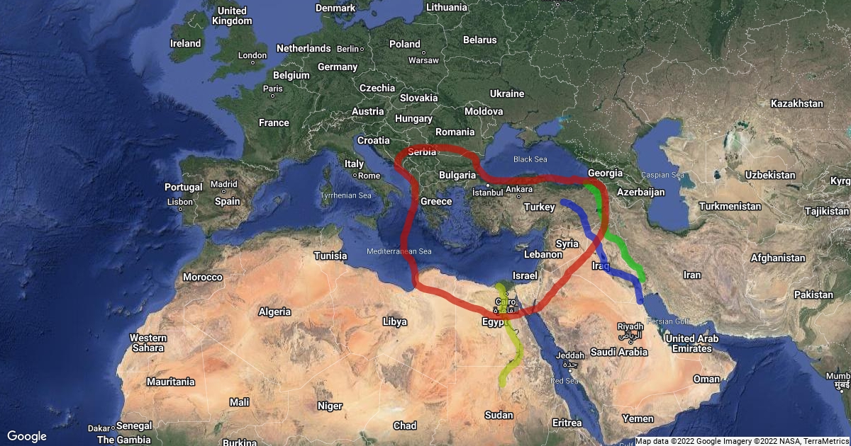 Nile, Tigris, and Euphrates river highlighted. As well as the border of the Byzantine Empire