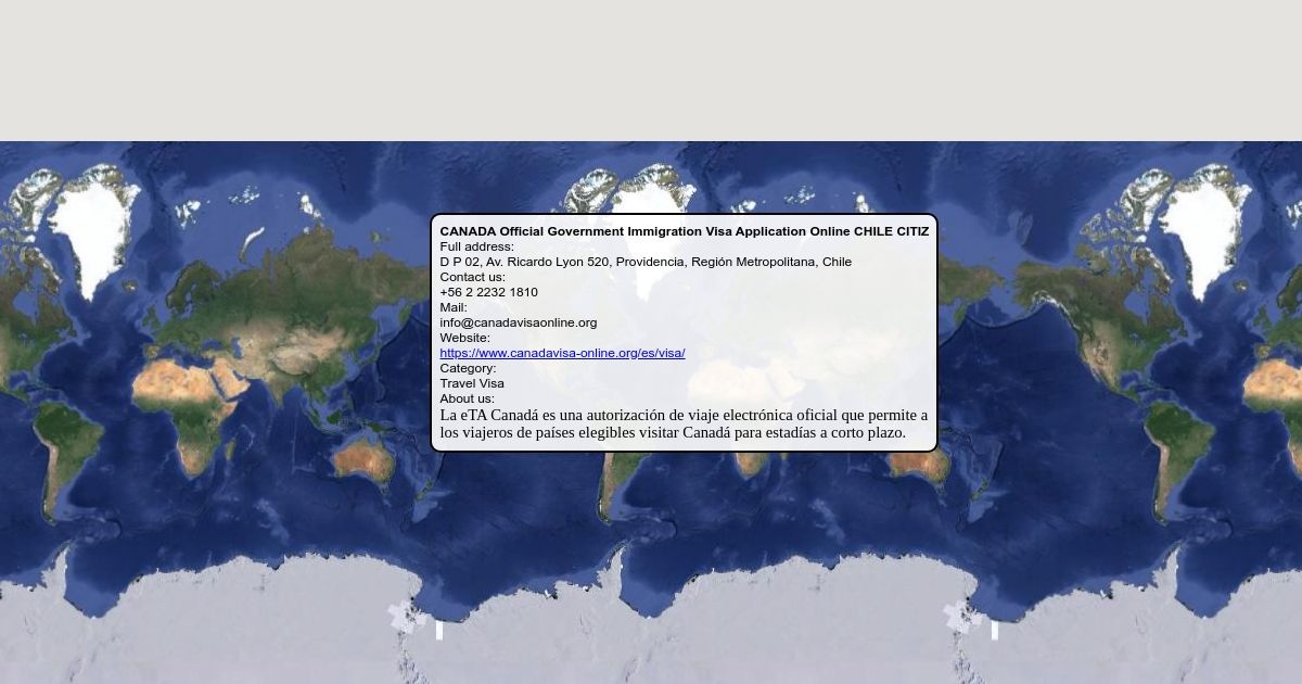 Full address: D P 02, Av. Ricardo Lyon 520, Providencia, Región Metropolitana, Chile Contact us: +56 2 2232 1810 Mail: [email protected] Website: https://www.canadavisa-online.org/es/visa/ Category: Travel Visa About us: La eTA Canadá es una autorización de viaje electrónica oficial que permite a los viajeros de países elegibles visitar Canadá para estadías a corto plazo.