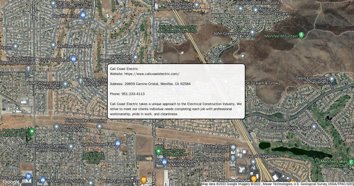 Website: https://www.calicoastelectric.com/ Address: 29859 Camino Cristal, Menifee, CA 92584 Phone: 951-233-4113 Cali Coast Electric takes a unique approach to the Electrical Construction Industry. We strive to meet our clients individual needs completing each job with professional workmanship, pride in work, and cleanliness