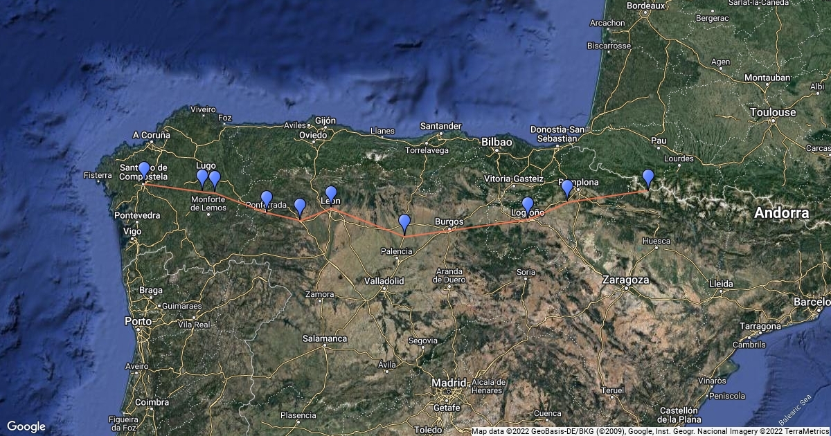 Camí de Sant Jaume des de Somport passant per diferents pobles fins arribar a Santiago de Compostel·la.