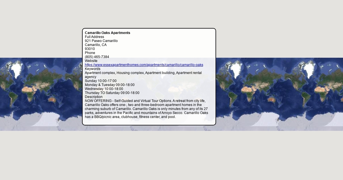 NOW OFFERING - Self-Guided and Virtual Tour Options. A retreat from city life, Camarillo Oaks offers one-, two and three-bedroom apartment homes in the charming suburb of Camarillo. Camarillo Oaks is only minutes from any of its 27 parks, adventures in the Pacific and mountains of Arroyo Secco. Camarillo Oaks has a BBQ/picnic area, clubhouse, fitness center, and pool.