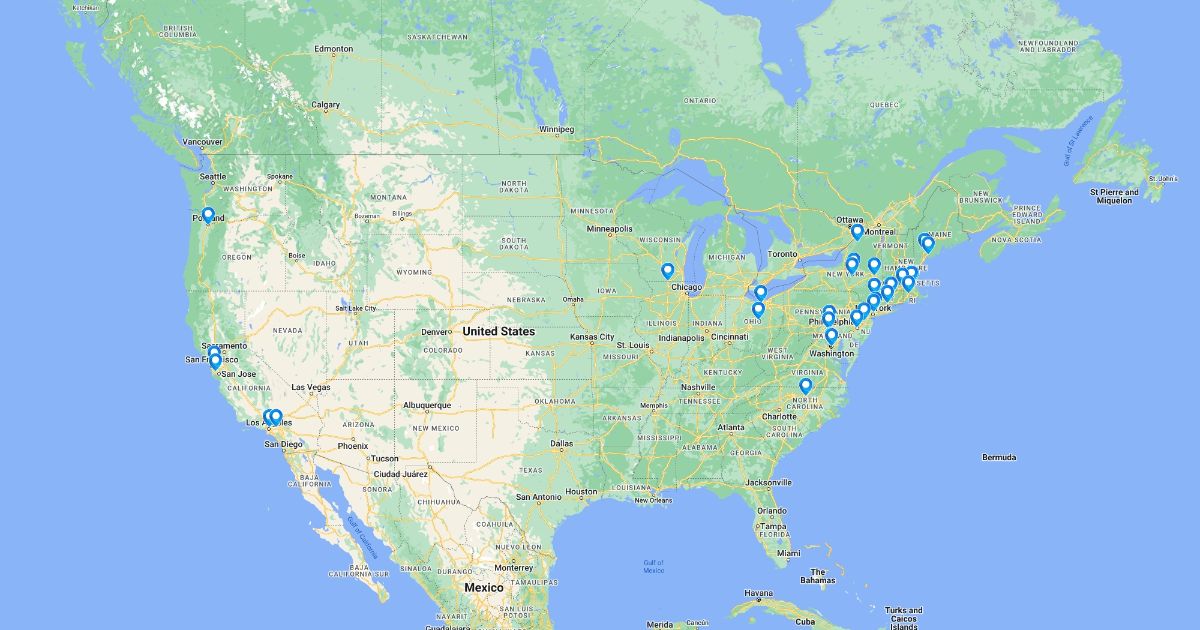 Map of the colleges that Catie wants to visit.