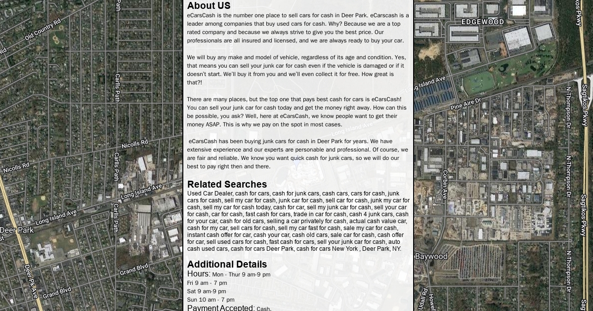 eCarsCash is the number one place to sell cars for cash in Deer Park. eCarscash is a leader among companies that buy used cars for cash. Why? Because we are a top rated company and because we always strive to give you the best price. Our professionals are all insured and licensed, and we are always ready to buy your car.