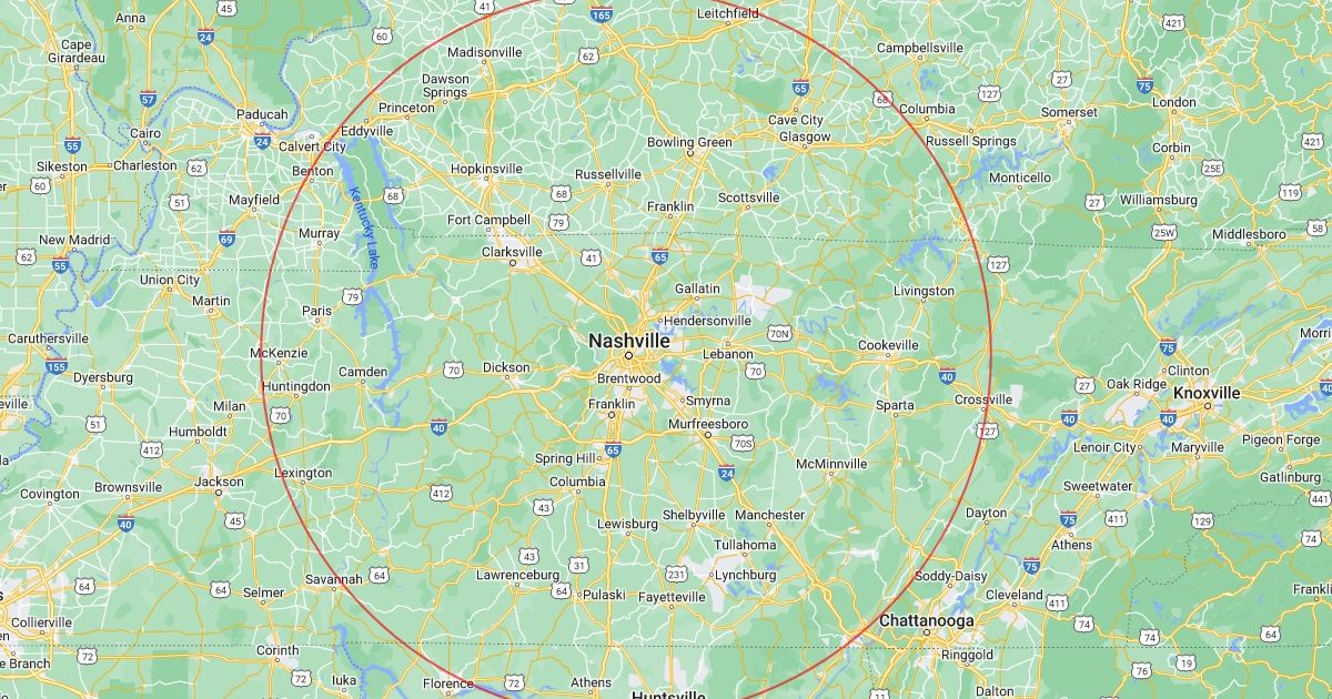 100 miles surrounding TN circled