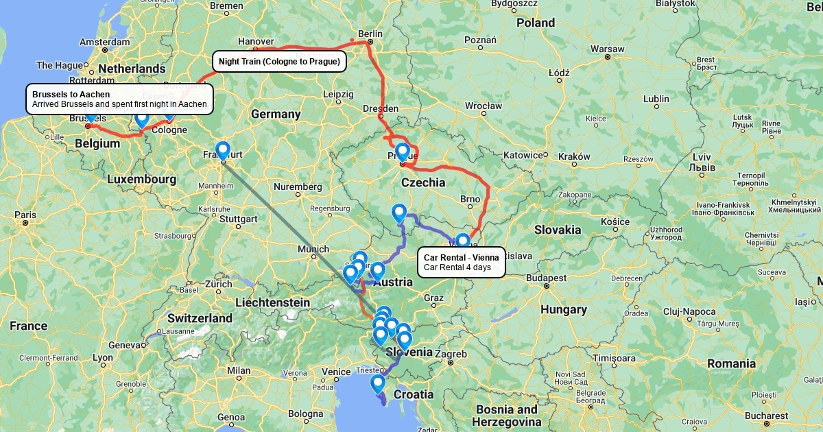 Trip route taken by rail and driving in Central Europe