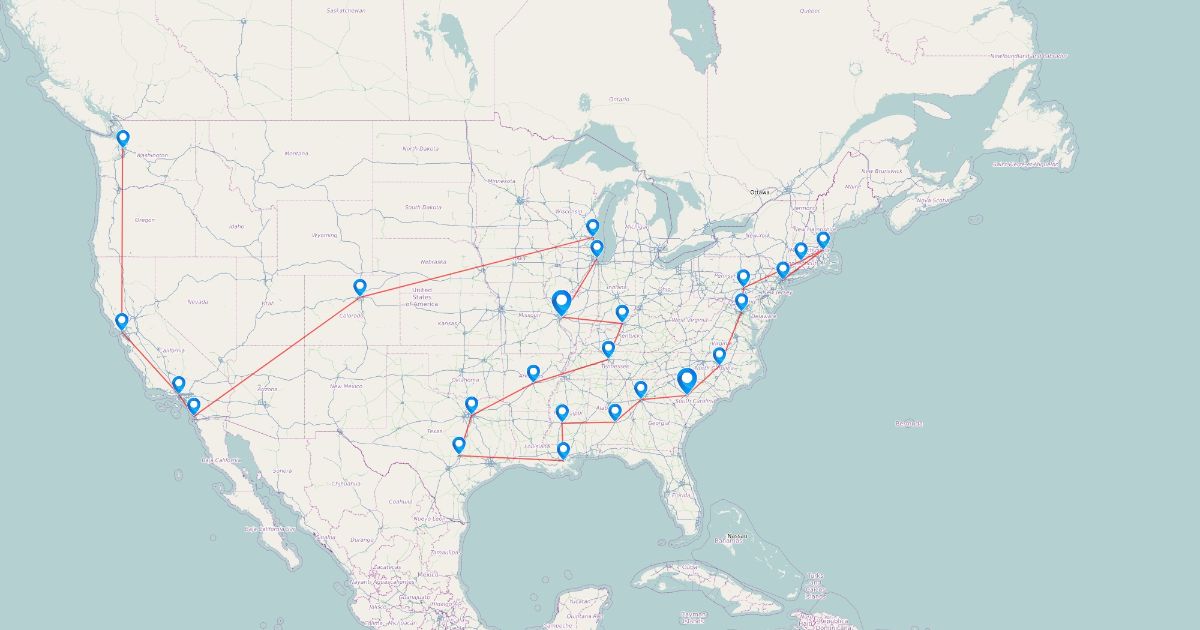 Her national tour, starting in Seattle and moving East. St. Louis and Columbia are marked.