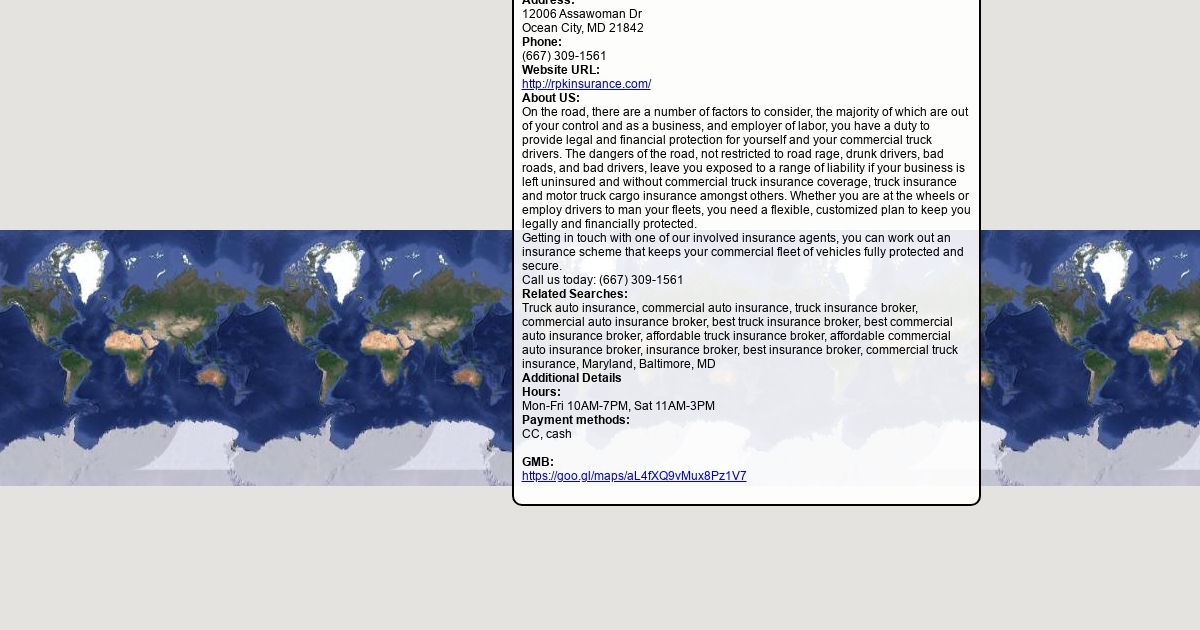 Contact Address: 12006 Assawoman Dr Ocean City, MD 21842 Phone: (667) 309-1561 Website URL: http://rpkinsurance.com/