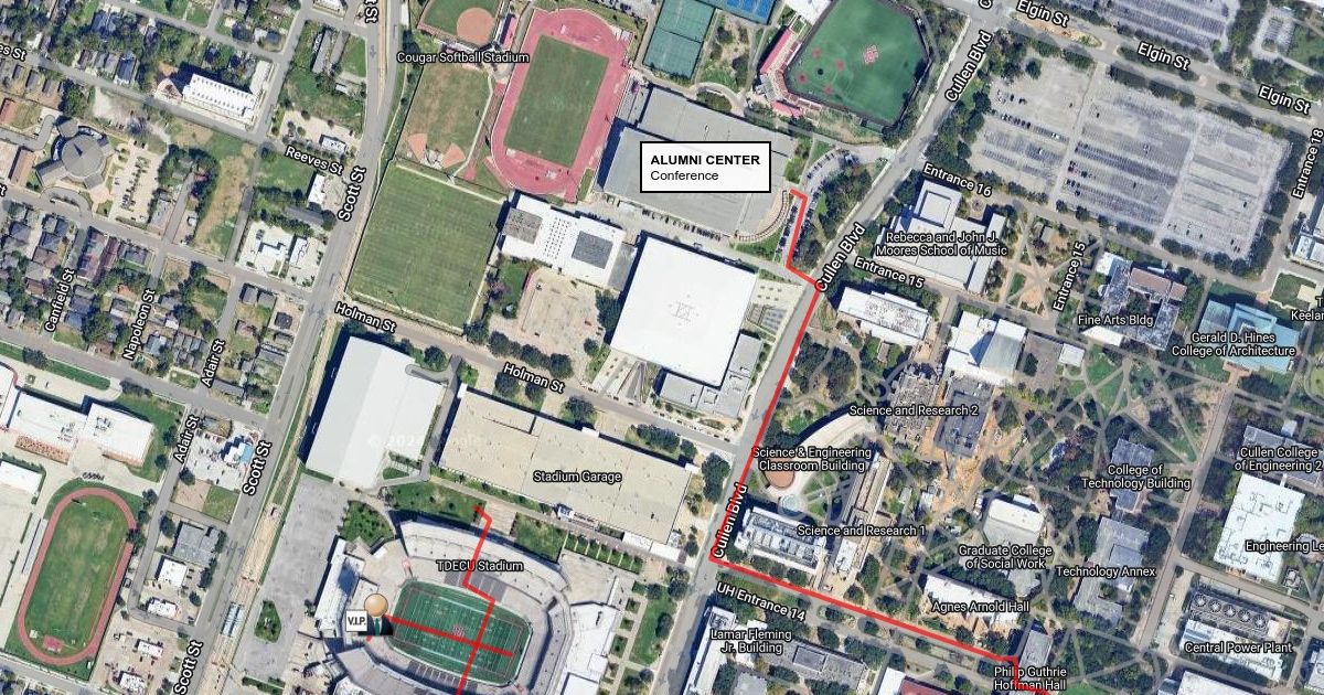 A map to get from the Stadium Garage to the Alumni Center