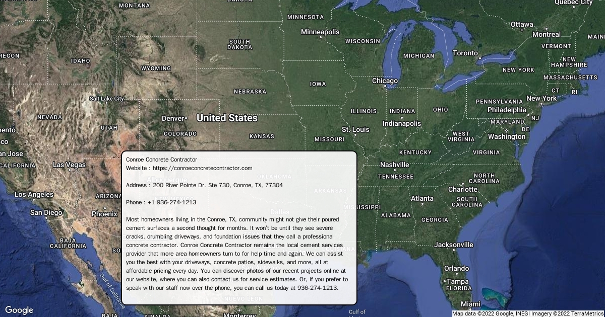 Website : https://conroeconcretecontractor.com Address : 200 River Pointe Dr. Ste 730, Conroe, TX, 77304 Phone : +1 936-274-1213 Most homeowners living in the Conroe, TX, community might not give their poured cement surfaces a second thought for months. It won’t be until they see severe cracks, crumbling driveways, and foundation issues that they call a professional concrete contractor. Conroe Concrete Contractor remains the local cement services provider that more area homeowners turn to for help time and again. We can assist you the best with your driveways, concrete patios, sidewalks, and more, all at affordable pricing every day. You can discover photos of our recent projects online at our website, where you can also contact us for service estimates. Or, if you prefer to speak with our staff now over the phone, you can call us today at 936-274-1213.