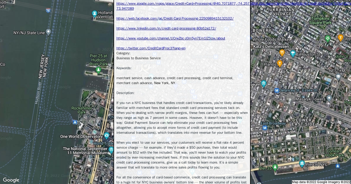 Address: 385-387 Broadway New York, NY 10013 Phone: 646-918-8848 Website: https://freeoffer.globalpaymentsource.com/credit-card-crocessing-nyc/ Hours: 9am - 5pm Payment Method: all credit cards