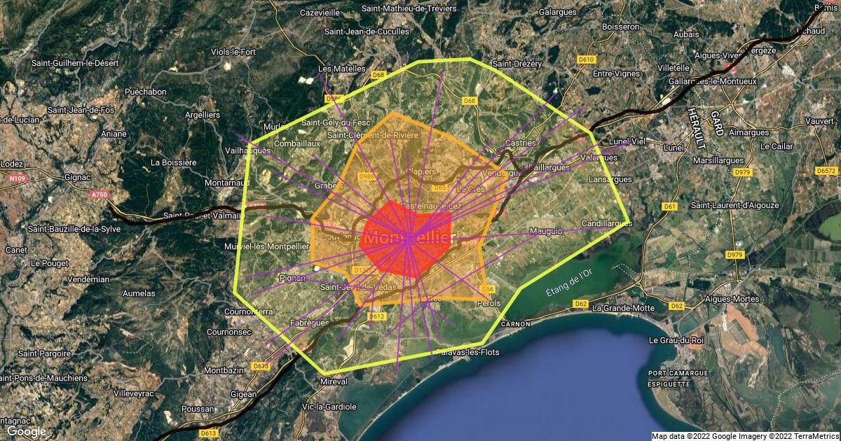 Croquis de Montpellier: -Aire Urbaine; Pôle Urbain; Ville-centre -Autoroutes -Migration Pendulaire