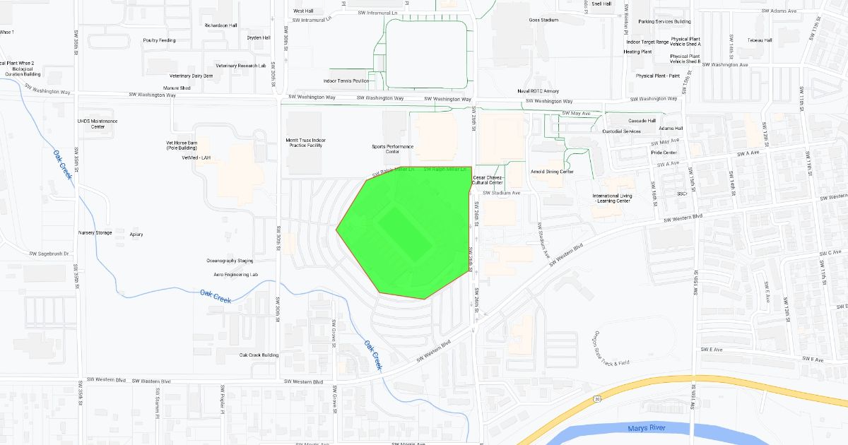 Map of campus use. All festival activity will be on Parker Plaza. Ralph Miller is closed, but 26th is not.