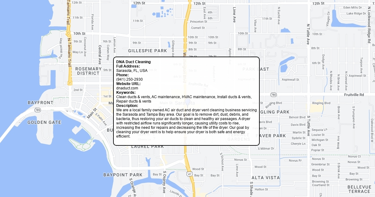 Full Address: Sarasota, FL, USA Phone: (941) 250-2930 Website URL: dnaduct.com Keywords: Clean ducts & vents, AC maintenance, HVAC maintenance, Install ducts & vents, Repair ducts & vents Description: We are a local family owned AC air duct and dryer vent cleaning business servicing the Sarasota and Tampa Bay area. Our goal is to remove dirt, dust, debris, and bacteria, thus restoring your air ducts to clean and healthy air passages. A dryer with restricted airflow runs significantly longer, causing utility costs to rise, increasing the need for repairs and decreasing the life of the dryer. Our goal by cleaning your dryer vent is to help ensure your dryer is both safe and energy efficient.