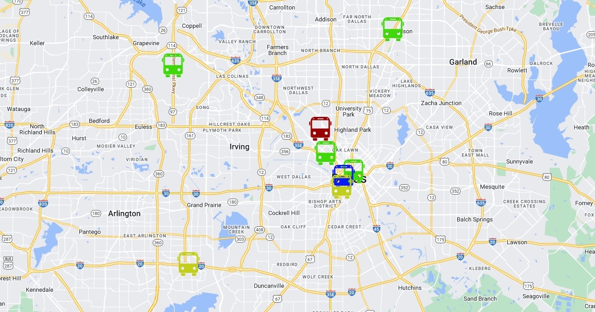 This map marks all the intercity bus stops in the City of Dallas. Each marker contains detailed guidance and instructions. The corresponding markers in Austin are also included.