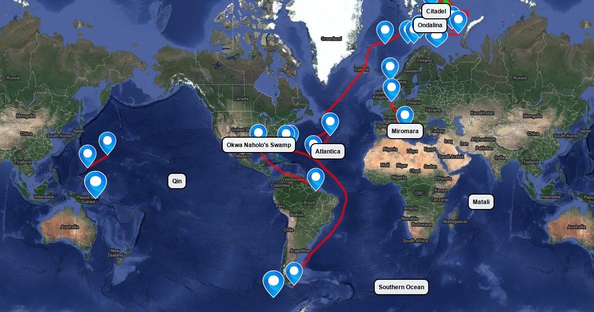 Map of book three, Dark Tide, paths of characters.