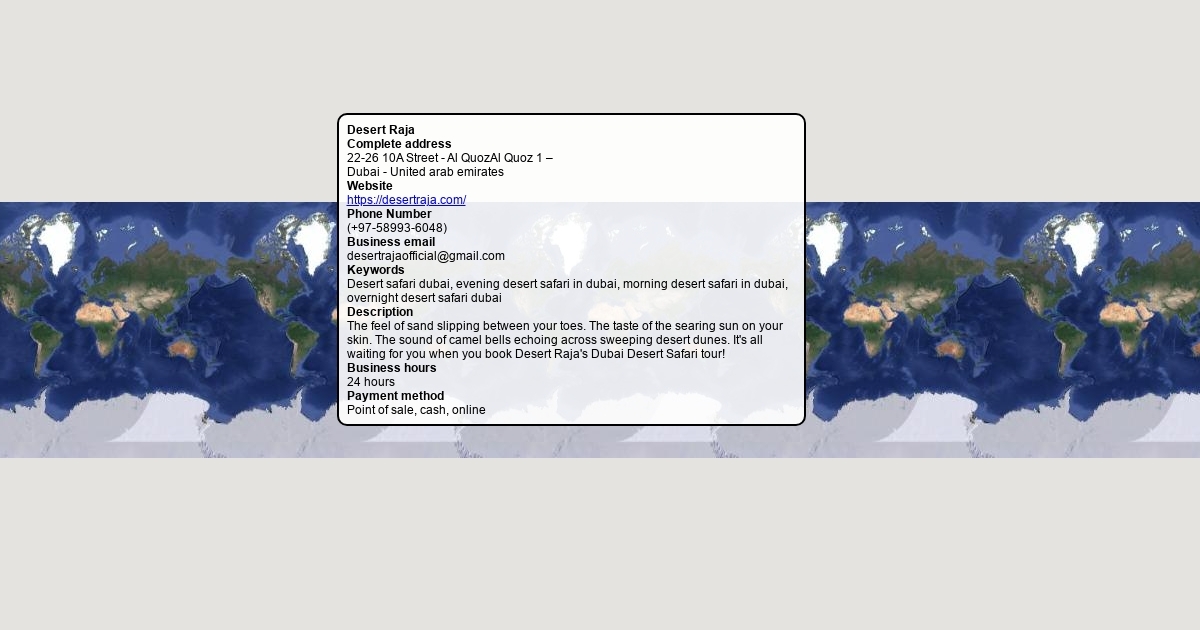 Complete address 22-26 10A Street - Al QuozAl Quoz 1 – Dubai - United arab emirates Website https://desertraja.com/ Phone Number (+97-58993-6048) Business email [email protected] Keywords Desert safari dubai, evening desert safari in dubai, morning desert safari in dubai, overnight desert safari dubai Description The feel of sand slipping between your toes. The taste of the searing sun on your skin. The sound of camel bells echoing across sweeping desert dunes. It's all waiting for you when you book Desert Raja's Dubai Desert Safari tour! Business hours 24 hours Payment method Point of sale, cash, online