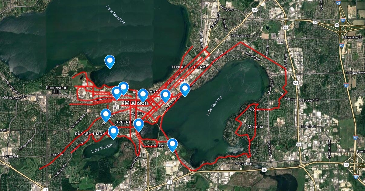 Map of bike routes in downtown Madison, with some locations of interest.