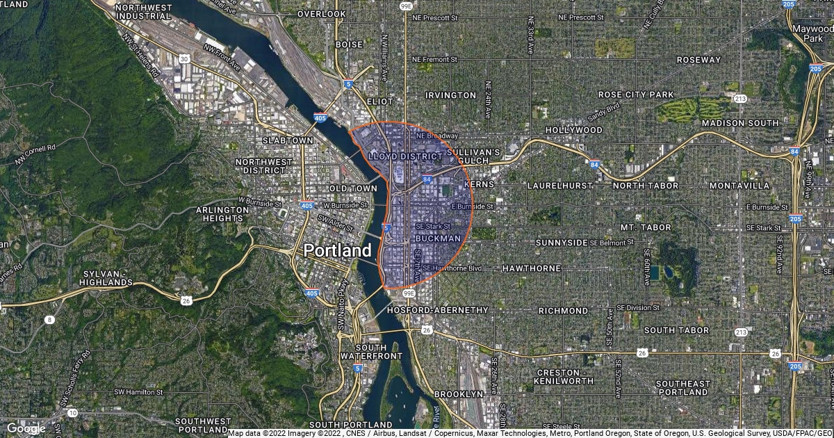 2 mile radius from Eastside of Burnside Bridgehead