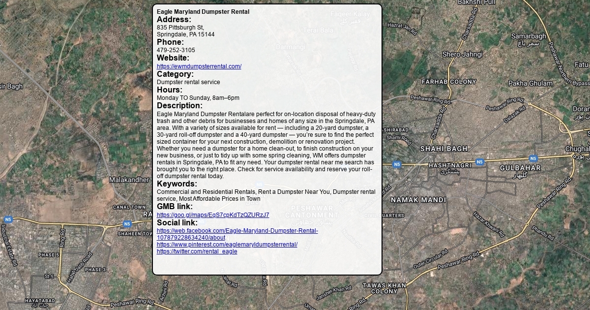 Address: 835 Pittsburgh St, Springdale, PA 15144 Phone: 479-252-3105 Website: https://ewmdumpsterrental.com/ Category: Dumpster rental service