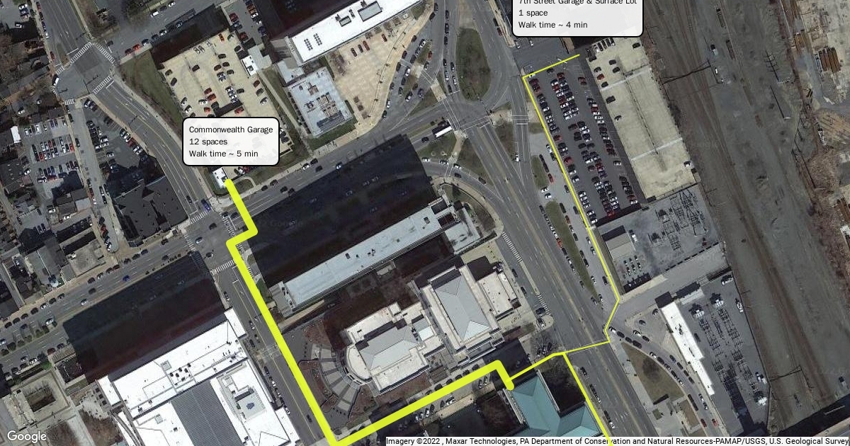 Shows walking route and times from assigned parking spaces