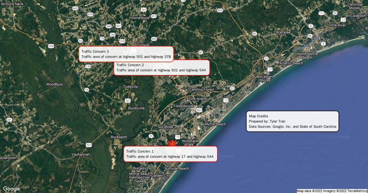 Map of the South Carolina evacuation routes with areas of traffic concern highlighted