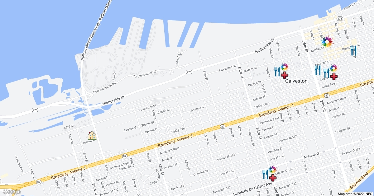 This is a map that lists some free resources provided around Galveston Island such as food, healthcare, shelter, and social services.